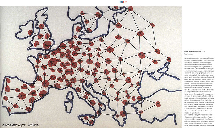 The catalog introduces, around the texts of 15 authors (2), 50 projects or master plans (3), territory networking, insertions or plugs, re-labelling operations which reveal a search for identity, as outlined in the various programmes (especially with Zaha Hadid, Rem Koolhas, Vincente Guallart, Jakob & MacFarlane, Rudy Riciotti, etc.) achieved or underway in today's Europe.