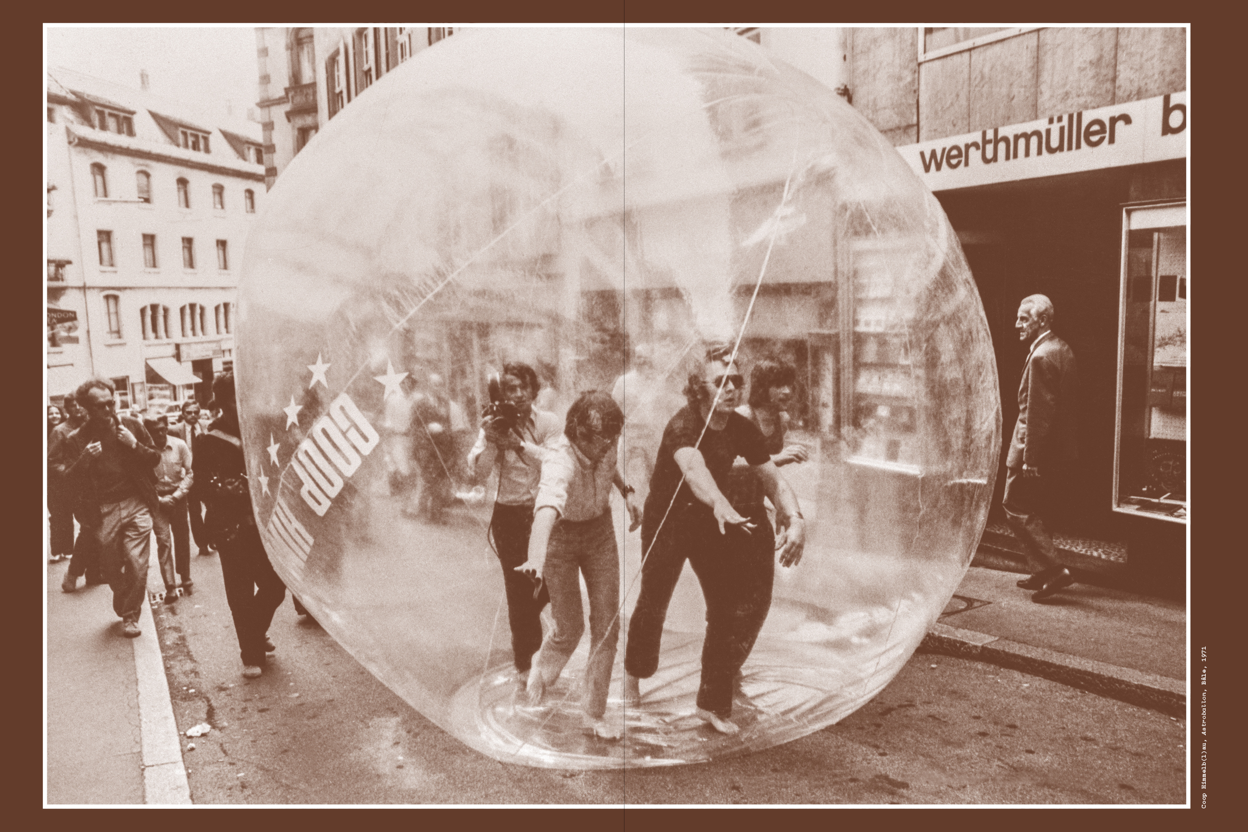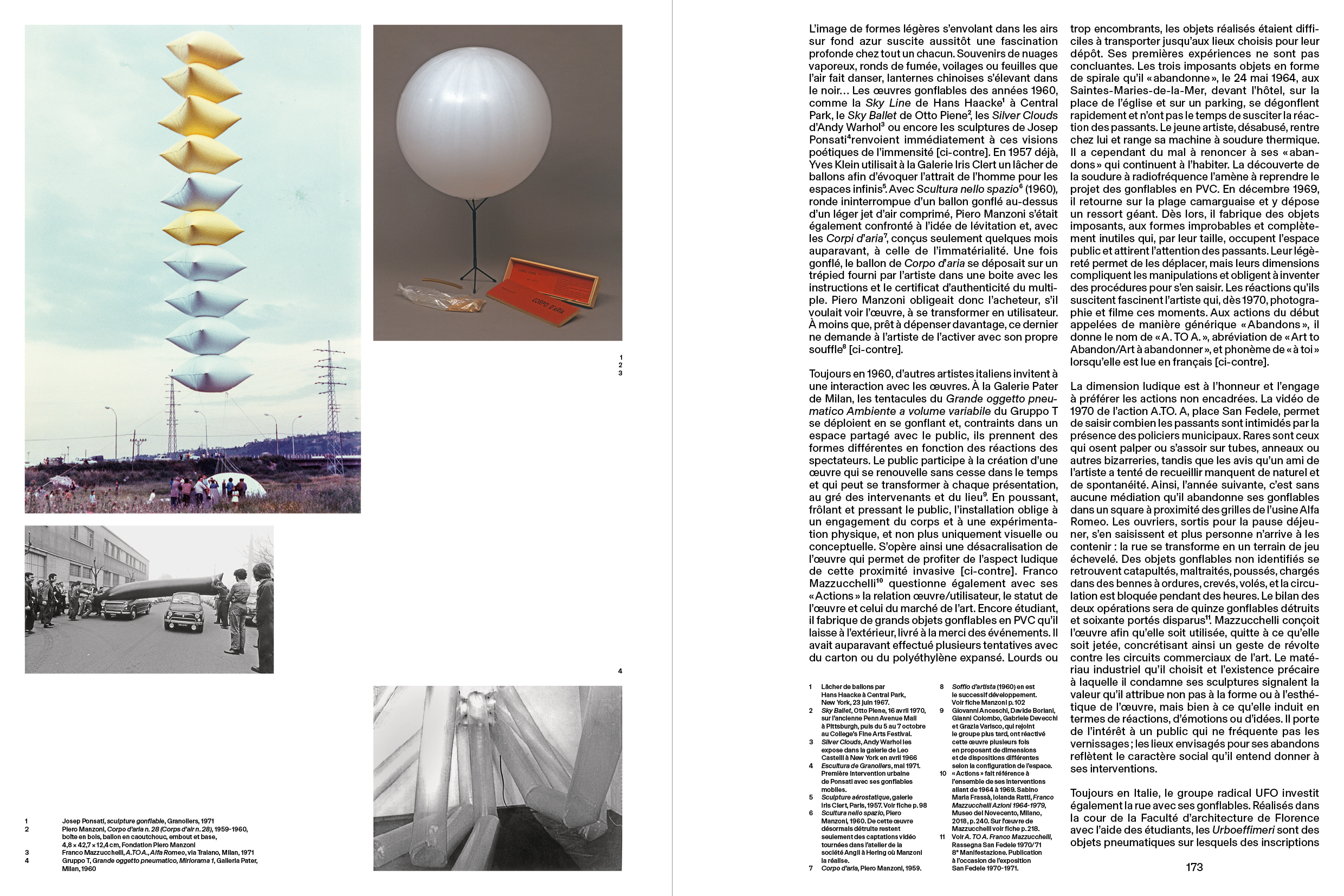 Dans les années 1970, le gonflable acquiert une fonction critique et politique. Il est un instrument pour des actions dans l’espace public dont s’emparent des artistes comme le Gruppo T ou Piero Manzoni, Yves Klein, Hans Haacke et Andy Warhol… Le groupe Utopie, les architectes radicaux de la scène viennoise, Hans Hollein, Walter Pichler, Haus-Rucker-Co et les Hollandais du Eventstructure Research Group en feront le support d’interventions ou de performances.