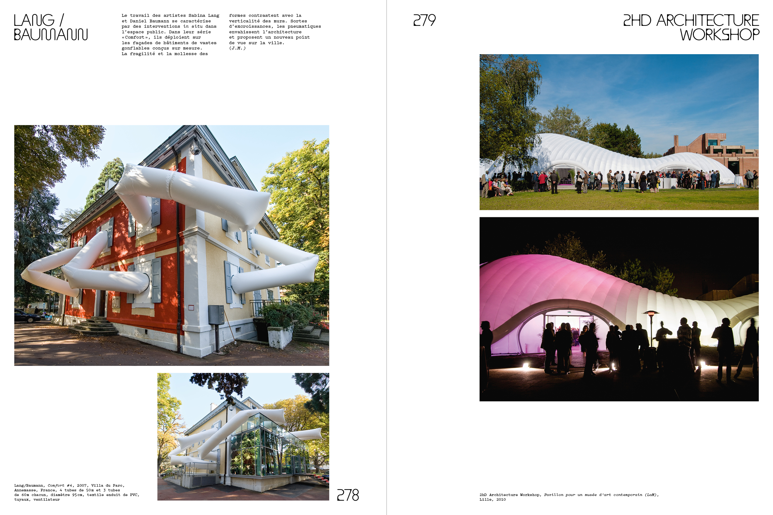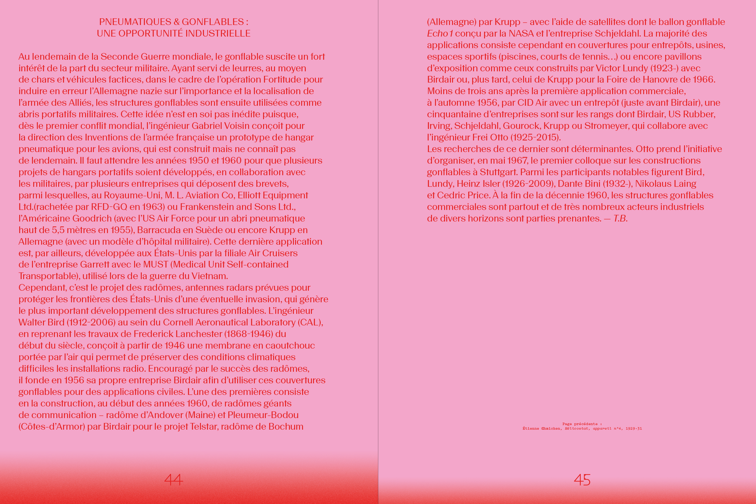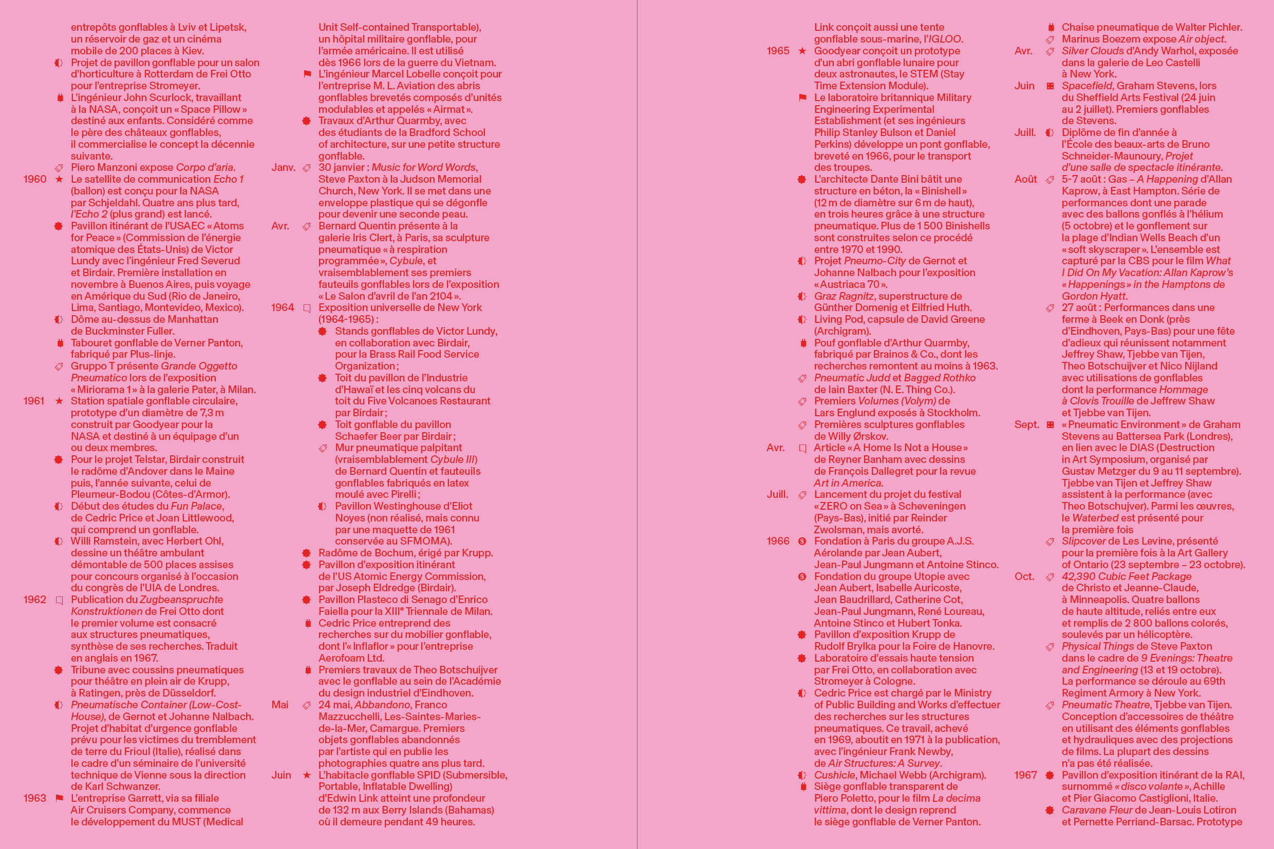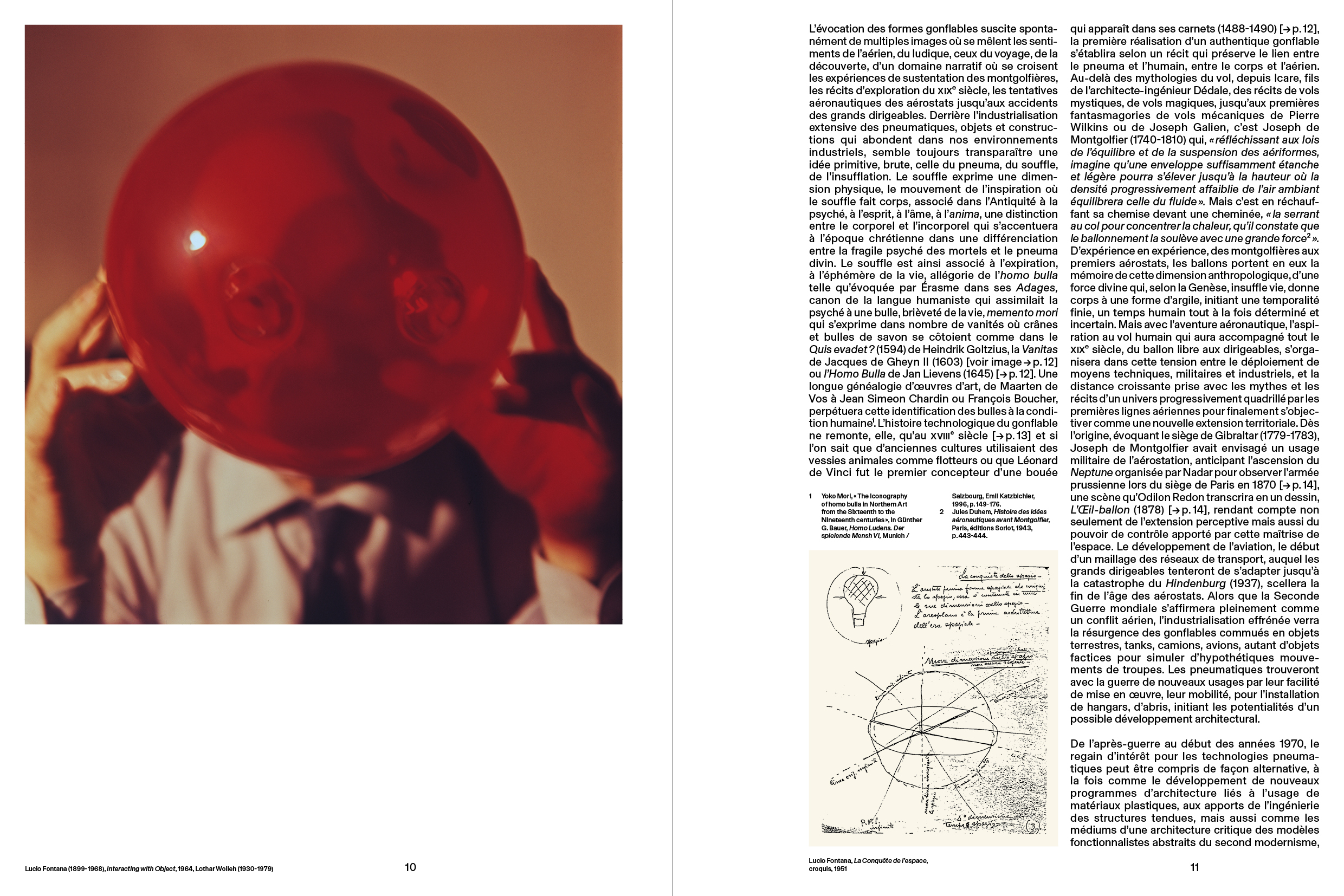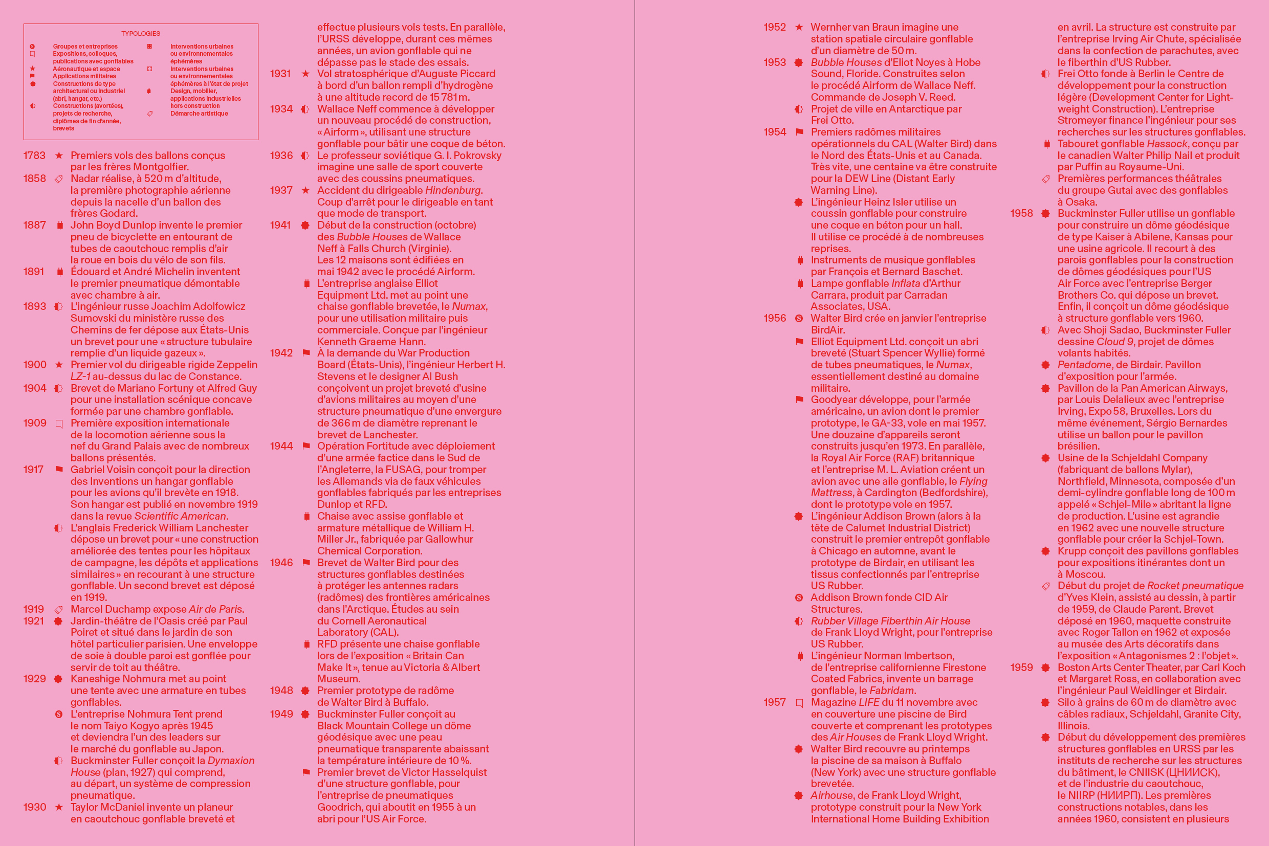 Évocation de l’aérien, de l'Antiquité à la Renaissance, l’histoire des gonflables ou des inflatable nous renvoie à celle d’une mythologie du vol, du pneuma ; un souffle vivant qui anime toute chose. Du rêve des frères Montgolfier jusqu’à l’avènement de l’aviation, c’est avec la Seconde Guerre mondiale que le gonflable trouve de nouvelles applications. À l’après-guerre, architectes et artistes vont alors s’emparer de ces innovations techniques. Des dômes géodésiques de Richard Buckminster Fuller aux projets d’architectes de Frei Otto, Cedric Price ou Arthur Quarmby, l’architecture gonflable deviendra une référence pour des collectifs en quête d’une nouvelle architecture mobile et modulable comme Archigram, Ant Farm ou Coop Himmelb(l)au.