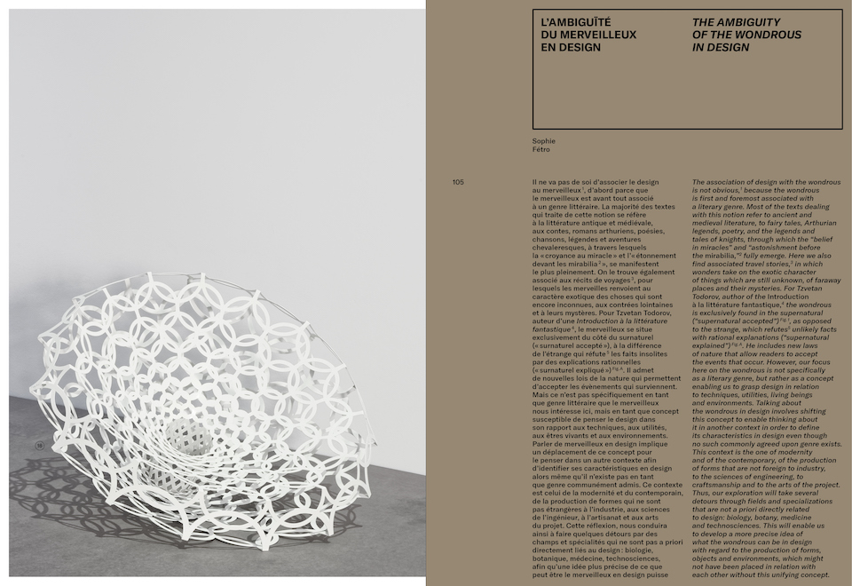 S'appuyant sur une sélection d'œuvres de plus de cinquante artistes, organisée en sept thématiques* accompagnées de notices, quatre essais (Marie-Ange Brayer, Spyros Papapetros, Martine Dancer-Mourès et Sophie Fétro), nous donnent à lire et comprendre, l'évolution du design et de l'ornement, à l'ère du numérique. Une période où l’ornement s’ouvre à la notion de « merveilleux » dans une nouvelle dimension générative de la nature.