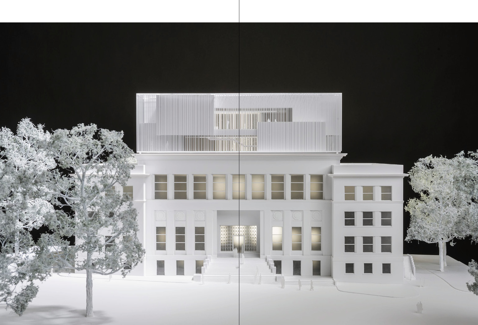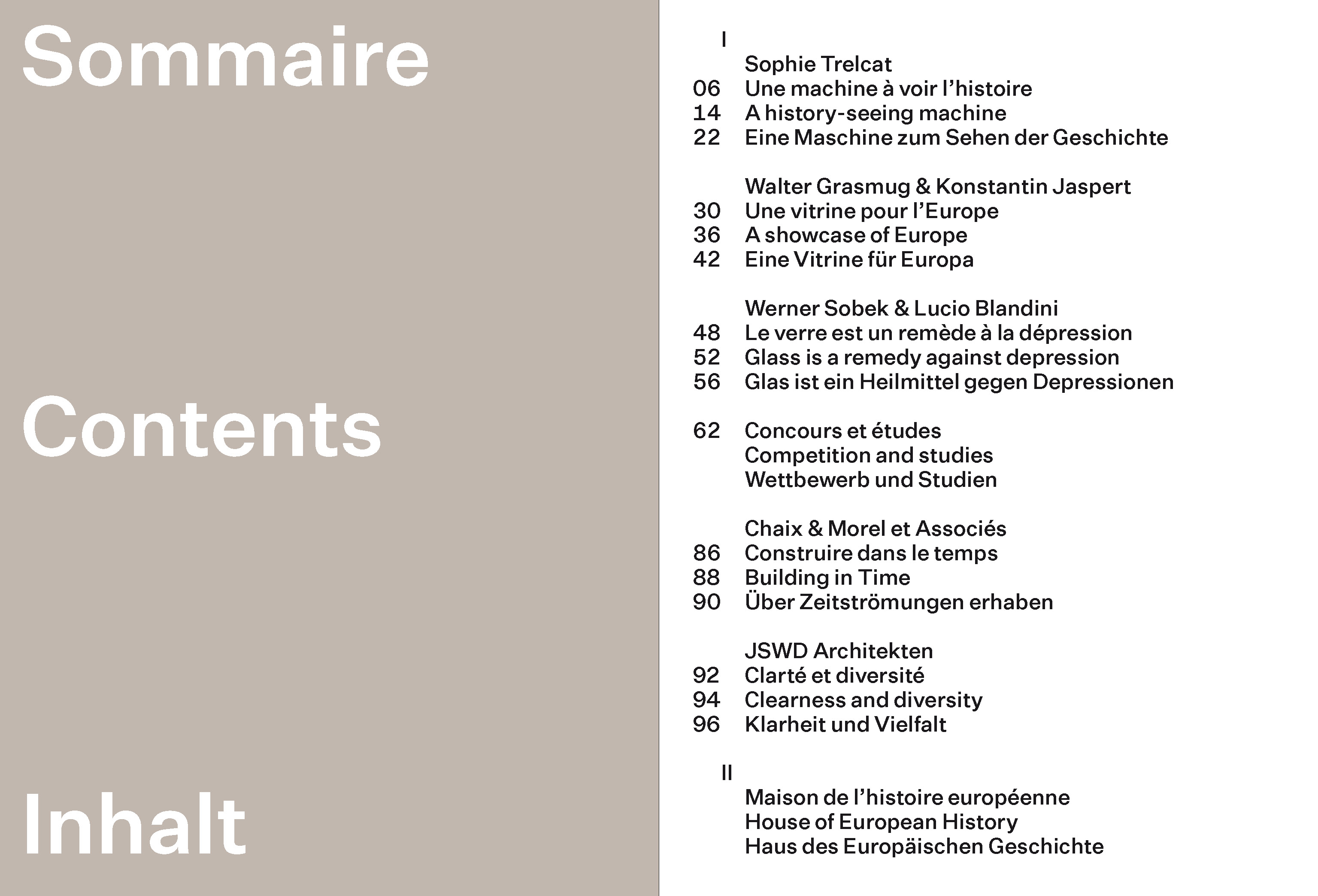 Pour cet ouvrage trilingue, les graphistes Baldinger et Vu-Huu ont transposé le concept du bâtiment en deux volumes aux formats différents sous reliure suisse. Sophie Trelcat, aborde, dans le livre I, l'histoire générale du projet et de son contexte et entre ensuite en discussion avec les architectes du projet - Walter Grasmug (Chaix et Morel et Associés) et Konstantin Jaspert (JSWD Architekten) - et les ingénieurs Werner Sobek et Lucio Blandini. Principalement illustré, le livre II montre les différentes phases de réalisation du bâtiment - dont l'escalier suspendu et la façade de verre inédite - jusqu'à sa livraison.