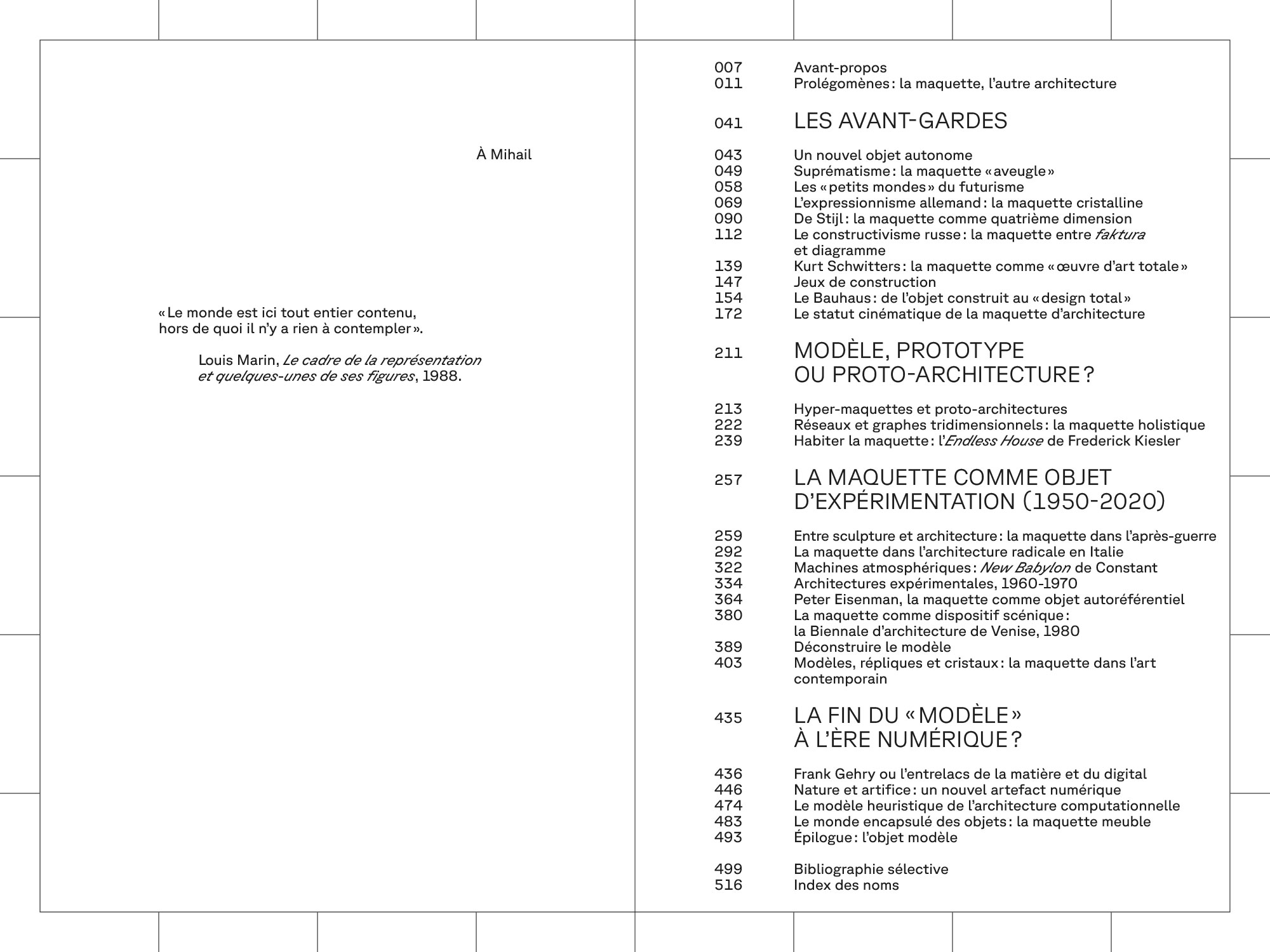 Le livre examine la manière avec laquelle la maquette ne cesse de migrer vers d’autres champs disciplinaires. La maquette se donne comme un objet mutant qui brouille les limites entre mobilier, sculpture et architecture. À travers sa dimension de miniaturisation, la maquette joue de son ambiguïté, entre instrument de mesure et objet plastique. D’Olafur Eliasson à Andrea Branzi, la maquette s’affirme comme un « modèle à penser » la complexité du monde.