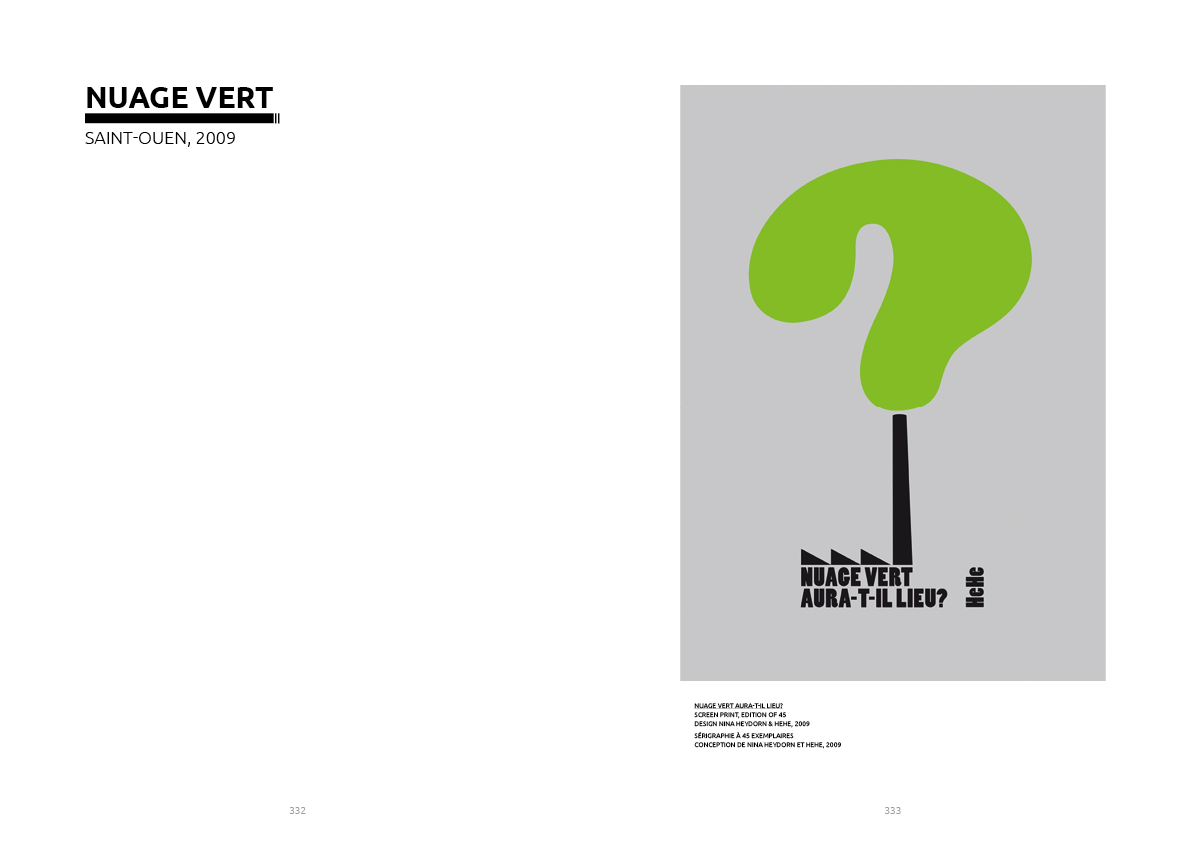 Sur les quinze projets présentés dans l’ouvrage, Nuage Vert - réalisé à Helsinki (2008) - est le plus ambitieux et le plus emblématique des projets qui a valu à HeHe le prestigieux "Golden Nica" du festival Ars Electronica en 2008. L'ouvrage présente également une documentation originale de la controverse politique provoquée par l'installation du "Nuage Vert" sur les incinérateurs de Saint-Ouen (2009) et d'Ivry-sur-Seine (2010).