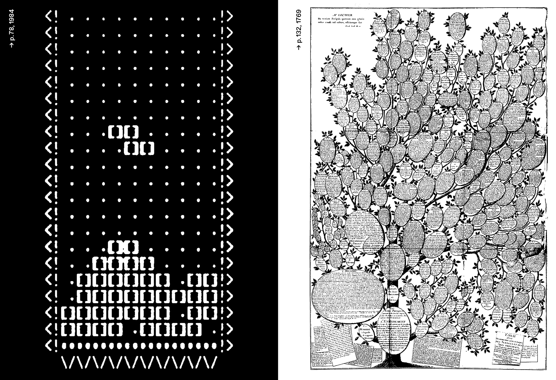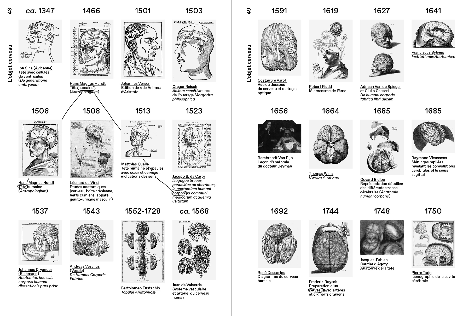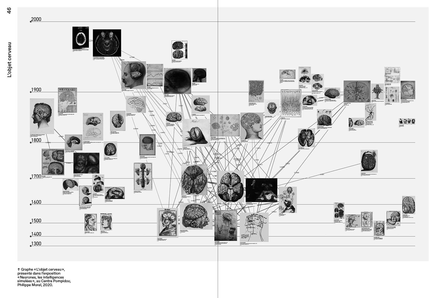 Les différentes thématiques sont organisées autour de graphes. Les visualisations de données accompagnées d’essais proposent une lecture originale de  l’IA. Ainsi, dans Corrélations, les intelligences simulées, Frédéric Migayrou nous présente l’histoire des recherches et des concepts qui déterminent aujourd’hui les enjeux de ces intelligences simulées. Un cerveau plastique de Camille Lenglois propose un panorama des créations contemporaines liées à ces thématiques. L'historien de l'art Pascal Rousseau avec Court-circuit, les neurones psychédéliques retrace les multiples expériences sensorielles du mouvement psychédélique. Les philosophes Pierre Cassou-Noguès (Pourquoi des tortues?) et Daniel Parrochia (Arboresences, graphes, réseaux, algorithmes) abordent les enjeux politiques et épistémologiques de l'IA.